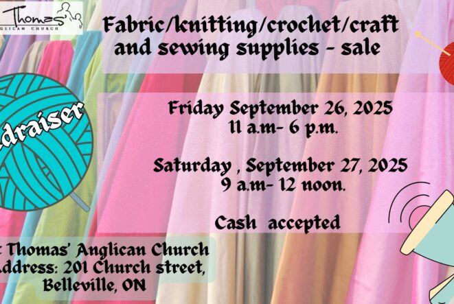 Craft Supply Sale on September 26 at St Thomas Anglican Church! Browse a sale of fabric, wool and craft supplies. Come out a purchase some items to start that special project.