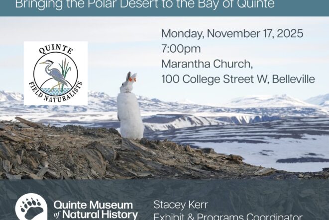 This presentation for the Quinte Field Naturalists will provide a sneak peek of a few key stories that will be included in Expedition Alert, including tales of impressive migration, fascinating adaptations, and ultimately resilience in the face of mounting climate change. Stacey will also share some of the challenges and learning experiences of creating an Arctic exhibit for an audience “down South”, as well as some exciting new technology-based museum elements that will help bring the exhibit to life in a whole new way for an intergenerational audience.