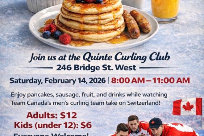 Join us at the Quinte Curling Club on Saturday, February 14, 2026, from 8:00 to 11:00 AM for our Olympic Pancake Breakfast! Enjoy a delicious spread of pancakes, sausage, fruit, and drinks while watching Team Canada’s men’s curling team take on Switzerland live from the Winter Olympics. Tickets are $12 for adults and $6 for kids under 12, and everyone is welcome. The event takes place at 246 Bridge St. West. For tickets and more information, call 613-962-5570. Come hungry and ready to cheer!
