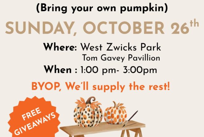 Join us at West Zwick’s Island Park (Tom Gavey Pavilion) for a spooktacular time. Bring your own pumpkin—real or fake—and let your creativity shine as you paint and design a one-of-a-kind masterpiece. (Tip: fake pumpkins paint beautifully and provide long-lasting curb appeal for Halloween!)