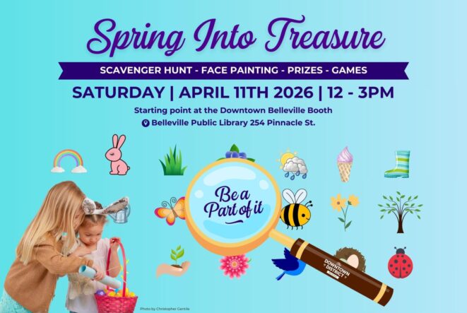 Gather some family and friends to experience the amazing Spring Into Treasure Scavenger Hunt! Happening in Downtown Belleville from 12 p.m. – 3 p.m. on Saturday, April 11, 2026. Grab your Bingo Card at the Downtown District Booth at the Belleville Public Library (254 Pinnacle St.), visit participating locations to collect stamps, and win prizes- while supplies last! Plus, get entered into a draw for the Grand Prizes. This event is for kids of all ages and is FREE to participate. Visit https://downtownbelleville.ca/events/spring-into-treasure/ or follow @downtownbelleville on socials to stay up to date!