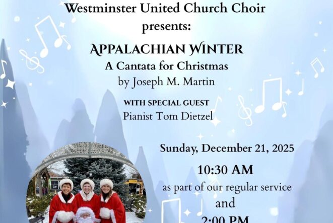 The Westminster United Church Choir is presenting “Appalachian Winter”, a Cantata for Christmas, with special guest, Pianist, Tom Dietzel, at Westminster United Church, 1199 Wallbridge Loyalist Road, Belleville, ON, K8N 4Z5 on Sunday, December 21st, 2025, at 2:00 pm. We will also be featuring special guests, The Christmas Belles.