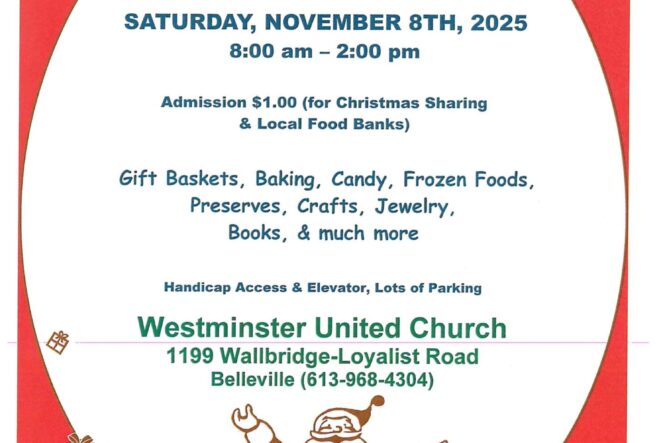 Westminster United Church, 1199 Wallbridge Loyalist Rd. in Belleville is having their annual Christmas Bazaar on Saturday, November 8th, 2025 from 8:00am-2:00pm.