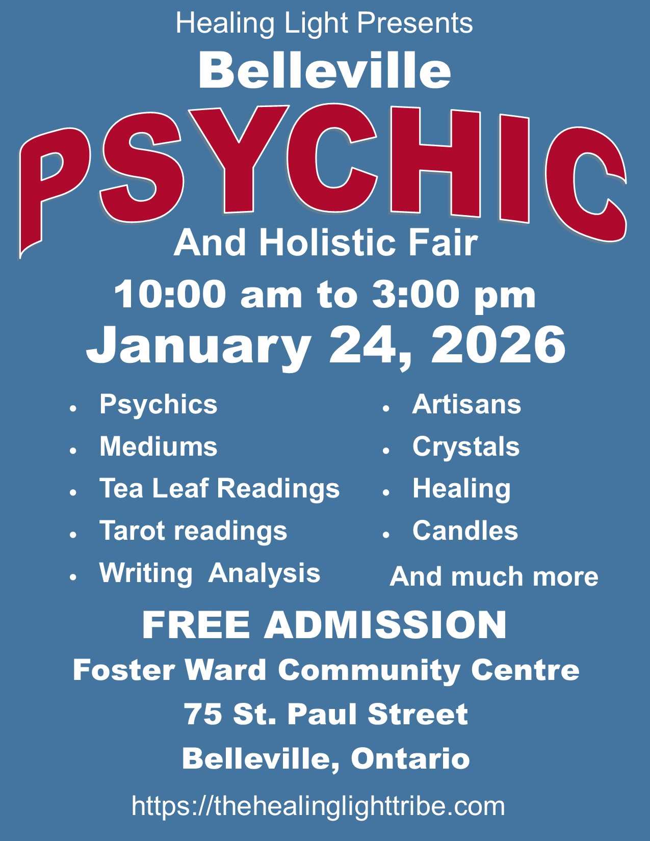 Join us on Saturday, January 24, 2026, for our Psychic and Holistic Fair, held at the Foster Ward Community Centre, 75 St. Paul Street, Belleville. You will experience a Magical time of intuitive readings, Healing, and shopping. Love, Light, and Kindness. For more info on our event, go to our website https://thehealinglighttribe.com