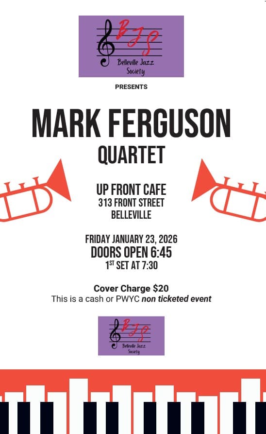 A special Belleville Jazz Society event! Mark Ferguson is an Ottawa-based pianist, trombonist, composer, arranger, producer, and music educator. He has performed with many of the world’s great artists, including Ella Fitzgerald, Tony Bennett, Gil Evans, Nelson Riddle, Dionne Warwick, Natalie Cole, Tom Jones, Engelbert Humperdink, Rosemary Clooney, Carol Channing, Rob McConnell & the Boss Brass, Holly Cole, Manteca, The Funk Brothers and the National Arts Centre Orchestra.