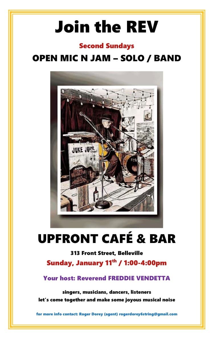 Come join the Rev on Sunday for a monthly open mic/jam session. No official house band – UpFront Cafe provides the P/A system, 2 microphones, an electric baby grand piano, and a set of drums. Bring your own guitar, amp if needed, snare, or instrument. Come out and play, or come to listen – you’ll have a great time! Doors open: noon Music: 1 – 4 pm No cover Licensed venue |