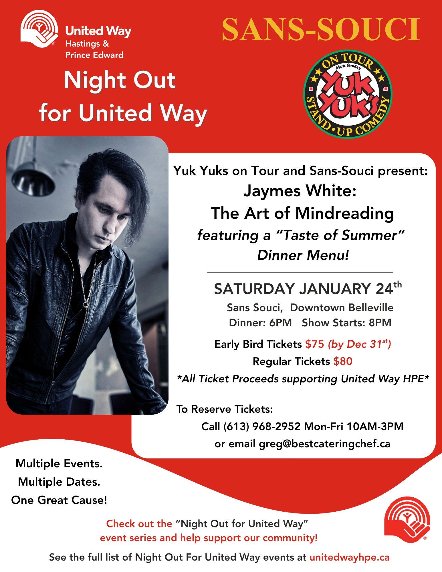 Enjoy a buffet dinner and a show (Jaymes White) $80.00 per person. ALL TICKET PROCEEDS to be donated to the United Way
