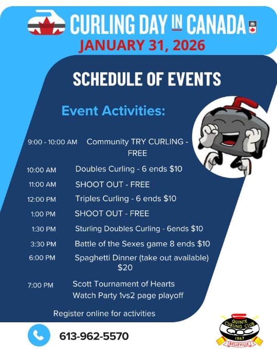 Join us at the Quinte Curling Club on Saturday, January 31, 2026, for Curling Day in Canada — a full day of fun, games, and community spirit! Starting at 9:00 AM, enjoy free Try Curling sessions and Shoot Outs, plus exciting six-end games of Doubles, Triples, Sturling Doubles, and a Battle of the Sexes match. Wrap up the day with a delicious spaghetti dinner at 6:00 PM and a Scotties Tournament of Hearts watch party at 7:00 PM. Game entries are $10, dinner is $20, and some activities are free. Register online at quintecurlingclub.ca or call 613-962-5570 for details. Everyone’s welcome — come celebrate curling with us!