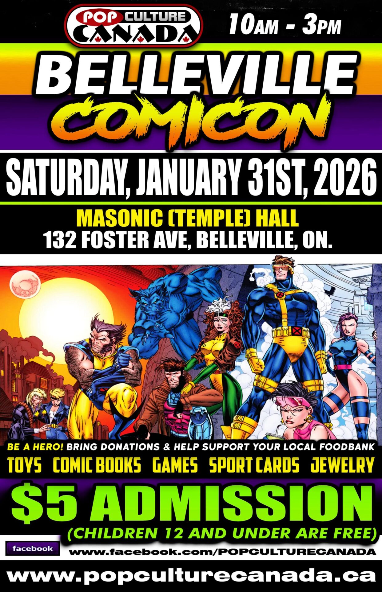 COMICON COMES TO YOUR TOWN! Vendors selling comic books / toys / video games / sports cards / jewelry and pretty much anything geeky cool ! Belleville’s One and Only ComiCon!! On: January 31st When: 10 am to 3 pm Where: Masonic (Temple) Hall Admission: $5 Online (Eventbrite) $10 at the door (cash and card accepted) Children 12 and under are Free with paid admission. $25 VIP includes: General admission PREMIER SHOPPING BAG which contains a Funko pop, as well as a pen, stickers, a pin, a lanyard and other collectable items. FOOD DONATIONS : Please bring unexpired non-perishable food items for your local community food bank and receive a FREE comic book when you donate 5 or more items.