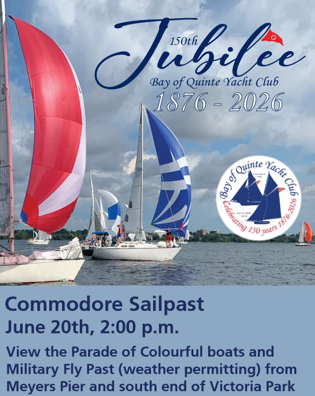 Celebrate 150 years of the Bay of Quinte Yacht Club with us! View the Parade of Colourful boats and Military Fly Past (weather permitting) from Meyers Pier and south end of Victoria Park.
