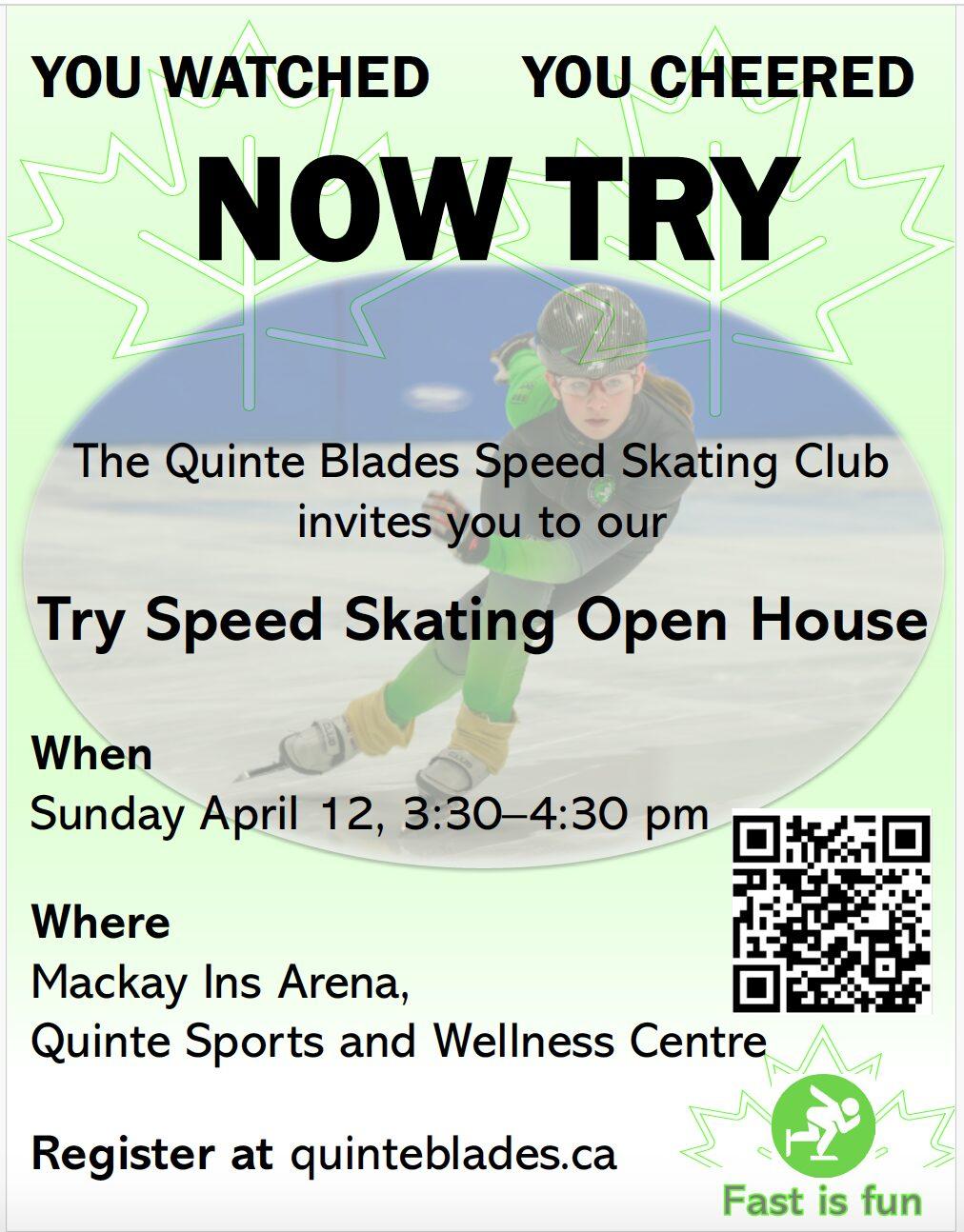 The Quinte Blades Speed Skating Club invites you to our Try Speed Skating Open House. You Watched, You Cheered, Now Try Long Blades Skating. Register to Try Speed Skating between 3:30pm – 4:30pm at quinteblades.ca Mackay Arena, Quinte Sports & Wellness Centre, Belleville or visit the Quinte Blades Speed Skating Club Information Table available 2:30pm – 5pm outside the Mackay Arena. Fast is fun!